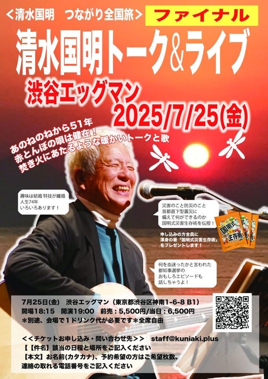 【申込先】staff@kuniaki.plus(件名に「7/25 渋谷Eggman清水国明ライブ」と明記)