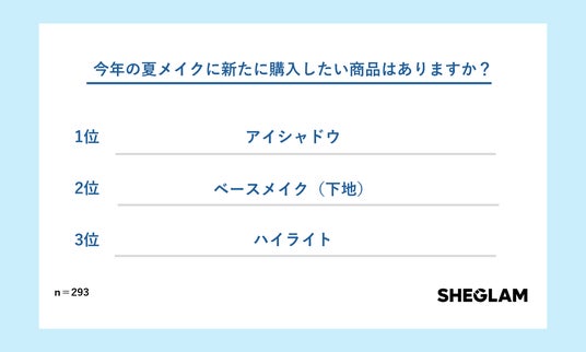 「今年の夏メイクに新たに購入したい商品はありますか?」という質問に対して、1位は『アイシャドウ』、2位は『ワンポイントアイテム』『ハイライト』『ベースメイク(下地)』が同率に。メイク初心者の方でもワンポイントに取り入れやすいアイテムの人気が高まり、夏らしいメイクを取り入れる人が増えている傾向が顕著となった。