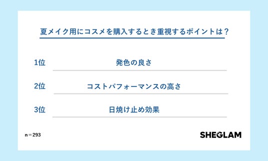 これまでの質問結果からも明らかになっているように、夏メイクは季節問わず日常使いがしやすいアイテムよりも、夏ならではのアイテムで夏の気分を上げるようなアイテムがトレンドであることが明らかに。そのため「夏メイク用にコスメを購入するとき重視するポイントは?」という質問に対して、『発色の良さ』と『コストパフォーマンスの高さ』が1位に。夏の季節限定で楽しむアイテムが好まれる傾向にあるため、メイク映えする高機能性とコストパフォーマンスの要素がカギとなっている。