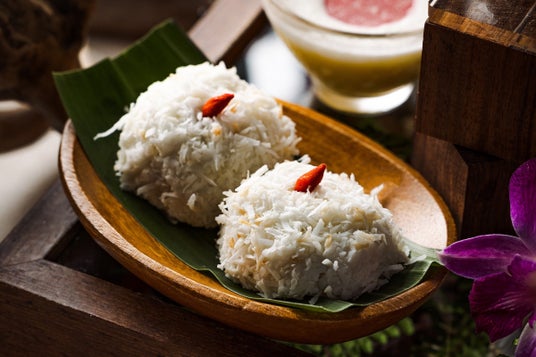 ココナッツをまぶした餅でこしあんを包み、南国を感じるほっとする甘さの団子。