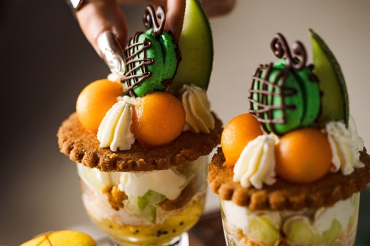 甘酸っぱいキウイソースや白ワインゼリー、ジンジャー香るライムジャムを層にし、2種のフレッシュメロンとふんわり生クリームを合わせました。仕上げには、メロンをイメージしたキュートなマカロンをトッピング。
