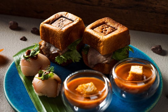セイボリーには、ブランドロゴの焼き印が入ったオリジナルブレッドを使った黒毛和牛サンドや、熟成ハマチの手毬寿司、スパイス香るローストトマトポタージュなど、多彩な味わいが並びます。