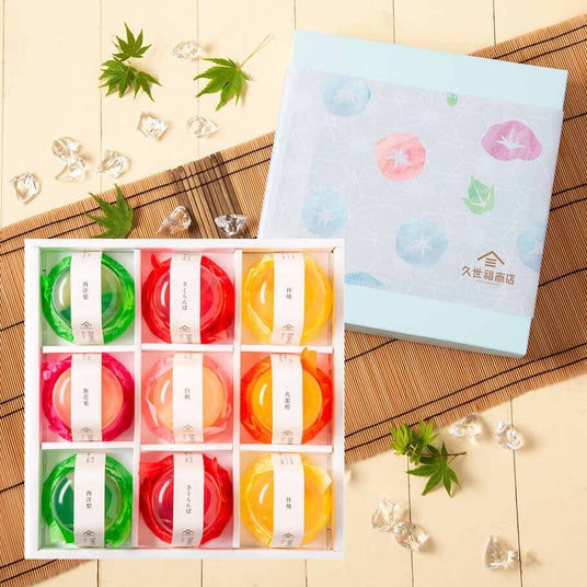 みずみずしい果実のおいしさをそのまま閉じ込めた、贅沢感あふれるひんやりゼリー9個の詰め合わせ。見た目も涼やかで、暑い夏にぴったりのギフトです。