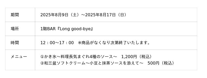 こちらのかき氷は、望楼NOGUCHI函館・海峡の風・啄木亭にご宿泊のお客様は、特別価格500円(税込)にてご提供致します。(※必ずご注文時にご宿泊ホテルのルームキーをご提示ください。)