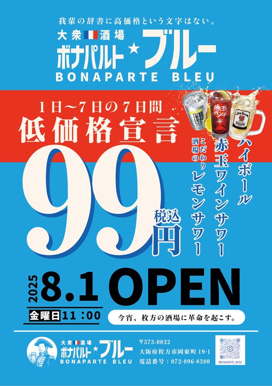 関西に初上陸する「大衆酒場ボナパルト・ブルー枚方店」のグランドオープンを記念して「ハイボール」「レモンサワー」「赤玉ワインサワー」が99円(税込)でご提供。枚方の酒場に革命を起こします。