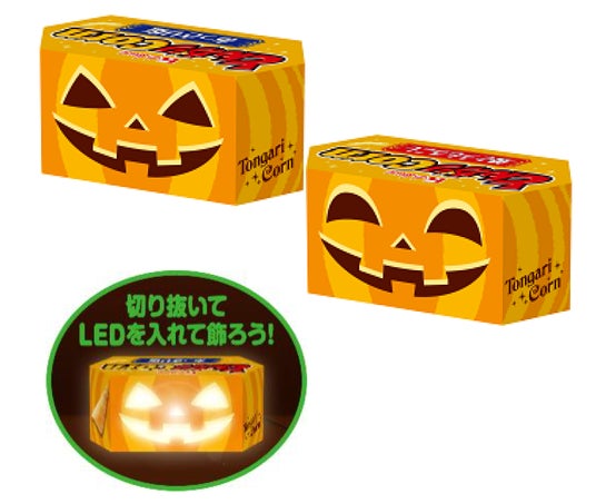 「とんがりコーン」<あっさり塩><焼とうもろこし>からは、ハロウィーンシーズンに合わせて、パッケージを切り取ってハロウィーングッズを作って遊べる”ハロウィーンパッケージ”を数量・期間限定で発売します。”ハロウィーンパッケージ”は、2014年から毎年秋に向けて販売しており、パッケージの裏面を切り抜くと、仮装を楽しめるお面やジャックオーランタンなど、パーティーにぴったりなハロウィーングッズを作ることができます。