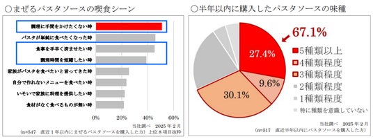 まぜるタイプのパスタソースは「調理に手間をかけたくない時」に選ばれることが多く、時短調理が可 能である点が重視されています。また、67.1%の方が3種類以上の味わいを選んで購入していることから、豊富な味のバリエーションが求められています。