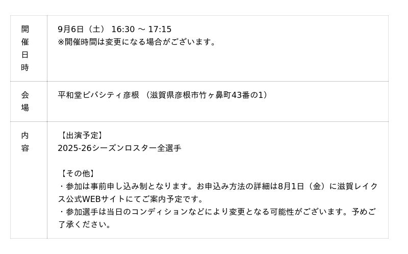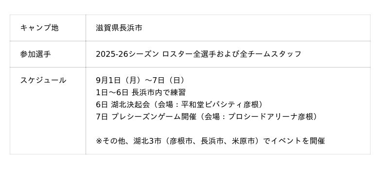 プロバスケットボール「B.LEAGUE」所属の滋賀レイクスでは、9月1日(月)~7日(日)の間、滋賀県の湖北エリア(彦根市、長浜市、米原市)にて2025-26シーズンの開幕に向けた「SHIGA湖北キャンプ2025 presented by 平和堂」を実施します。