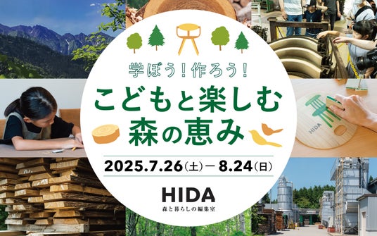 オリジナルの木工家具ブランドHIDAを通して森の恵みのある豊かな暮らしを提案している飛騨産業株式会社(本社:岐阜県高山市 代表取締役社長:岡田明子/以下 飛騨産業)は、夏休み特別企画として7月26日(土)から8月24日(日)までHIDA高山店 森と暮らしの編集室(以下HIDA高山店)にて、子供と一緒に楽しめる木工ワークショップや家具工場見学ツアーなど、自由研究にも活かせる体験プログラム「こどもと楽しむ森の恵み 2025」を開催します。木に触れて楽しみながら森の豊かさやSDGsについて学べるこの機会にぜひご参加ください。