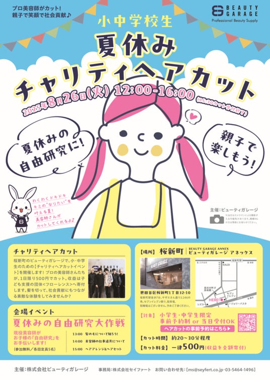 プロ向け美容商材EC最大手の株式会社ビューティガレージ(本社:東京都世田谷区、代表取締役会長兼CEO:野村秀輝)は、美容を通じた社会貢献の一環として、小中学生を対象とした「夏休みチャリティヘアカット」を2025年8月26日(火)に開催いたします。