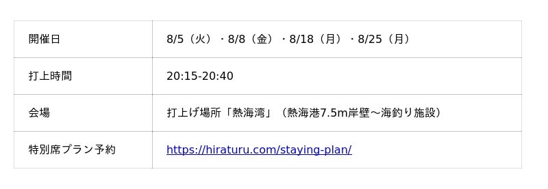 【夜空と海に咲く大輪の華】8月の熱海海上花火大会は計4回!5日(火)・8日(金)・18日(月)・25日(月)開催!特等席確約の送迎付きプランの販売中。夏の繁忙期は人気なので、ご予約はお早めに!