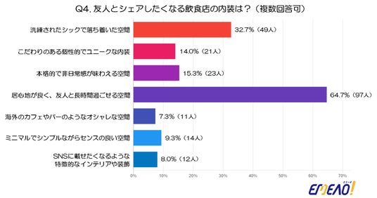 - 最も多かったのは「居心地が良く、友人と長時間過ごせる空間」(64.7%、97人)で、全体の約2/3がこの点を重視していることが分かります。友人とリラックスして過ごせる快適さが、シェアしたくなる飲食店の内装において圧倒的に求められています。