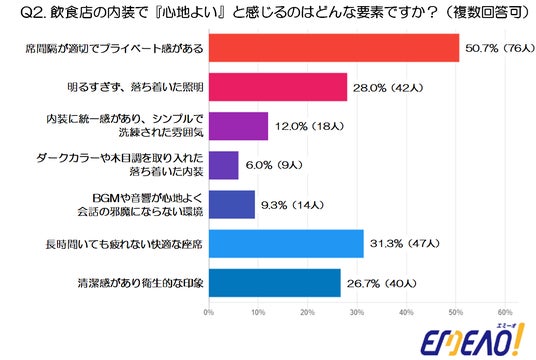 - 最も多かったのは「席間隔が適切でプライベート感がある」(50.7%、76人)で、半数以上が重視しています。周囲を気にせず過ごせるプライベート感が「心地よさ」につながっていることがうかがえます。