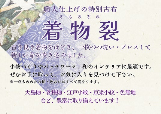 古き良き着物を丁寧にほどき、洗いとプレスを施した、手仕事の温もりが残る特別な古布。小物づくり・パッチワーク・和のインテリアに。世界に一つだけの美しさを、あなたの手で。