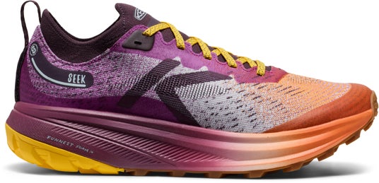 革新的な技術、ランナーからのリアルな声、そしてトレイルへの想いから生まれた『SEEK』。つま先にゆとりを持たせた広めの構造(ワイドフォアフット構造)により、足指が自然に広がりやすく、未舗装の不整地でも快適さと安定性を確保。通気性と耐久性を兼ね備えたポリエステルとTPUのニットアッパー、パッド入りタン、伸縮性のあるニットカフを組み合わせることで立体的に足を包み込み、高いフィット感を実現。そして、反発性と耐久性を両立した高エネルギーミッドソールを採用し、特にレクリエーショナルランナーに多い「かかと着地」に最適化された構造です。足への負担を軽減する設計と、環境への配慮を両立したトレイルランニングシューズで、長距離のランでも快適さとパフォーマンスを持続します。