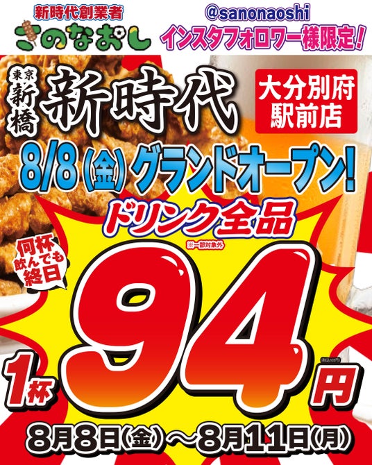 大分初上陸を祝しまして、8月8日(金)~8月11日(月)はメガ以外のドリンク全品、何杯飲んでも終日1杯94円(税込103円)のオープン記念イベントを開催いたします!新時代創業者「さのなおし」(@sanonaoshi)のInstagramフォロワー様限定となっております。このチャンスをお見逃しなく!