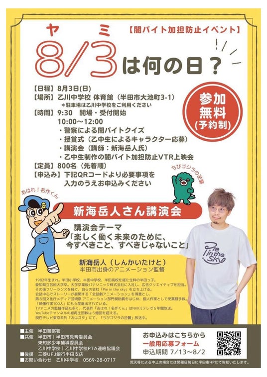 【愛知県半田市】8月3日(日)「闇バイト防止の日」 警察×学校×行政による闇バイト加担防止イベントを開催!講演会にはアニメ映画監督 新海岳人氏が登壇!