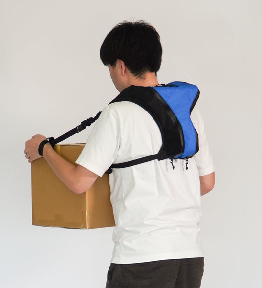 バッテリーとモーターを内蔵したリュック型の本体を背負い、肩から伸びたワイヤーを手首に装着。指先のセンサーによって荷物の保持を検知し、モーターがワイヤーを巻き上げることで、荷物を引き上げます。最大12kgのアシストを行い、上腕の負担を軽減。