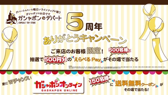 「えらべるPay(R)」500円分が500名さまにその場で当たる!さらにWチャンスも用意 ガシャポンのデパート5周年ありがとうキャンペーンを開催! 2025年8月1日(金)~8月31日(日)