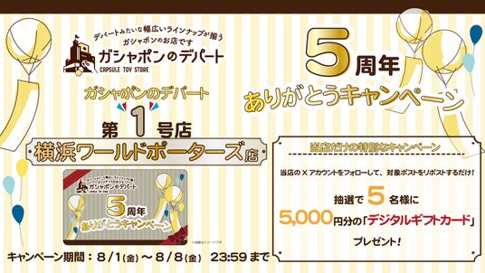 日頃から「ガシャポン」の愛称で親しんでいただいているお客さまへ、感謝の気持ちを込めて、2025年8月1日(金)~8月31日(日)の間、全国の『ガシャポンのデパート』で「ガシャポンのデパート5周年ありがとうキャンペーン」を開催します。