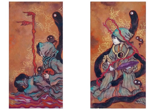 (左)《異界案内人・朔》H300×W150mm/ 岩絵具、水干絵具、胡粉、墨、金泥、膠、和紙、パネル / 2018、(右)《異界案内人・花》H300×W150mm/ 岩絵具、水干絵具、胡粉、墨、金泥、膠、和紙、パネル / 2018