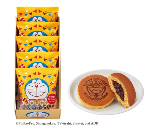 ふんわり生地で北海道産小豆の粒あんを包んだどら焼きに、ドラえもんの焼印を押しました。おやつにちょうどいい、個包装の小ぶりなサイズです。