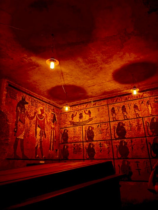 ルクソールで発見されたKV62(「王家の谷の62号墓」の意)。ツタンカーメンの王墓の玄室を、日本映画美術の職人技によってリアルに再現しました。監修の河江先生をして、「おおぉ、これはもう本物のようです!」と言わしめた角川武蔵野ミュージアムで展示したものをそのまま横浜に移築してきました。ルクソールに行かなければ感じられないその佇まい、サイズ感、壁画や副葬品、カビの生え具合までリアルに再現しています。