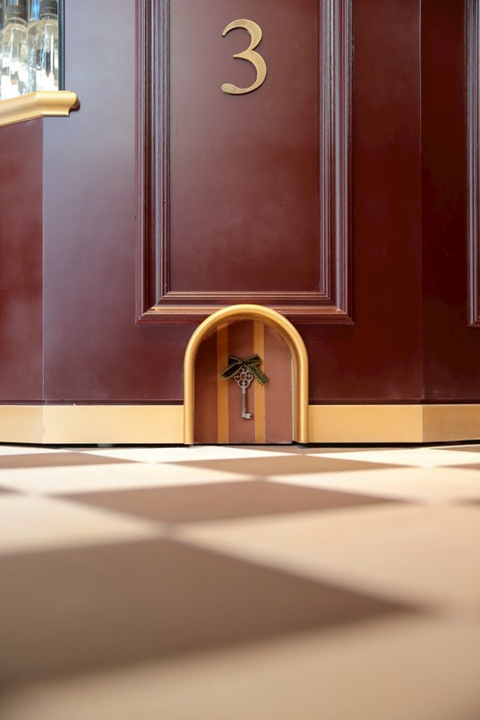 ブラウン×ゴールドを基調にした“チョコレートの壁”が象徴的。包装ボックスや客室キーなど細部に至るまで世界観をジャックし、どこを切り取っても絵になる空間に。