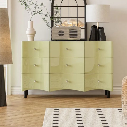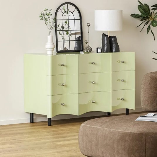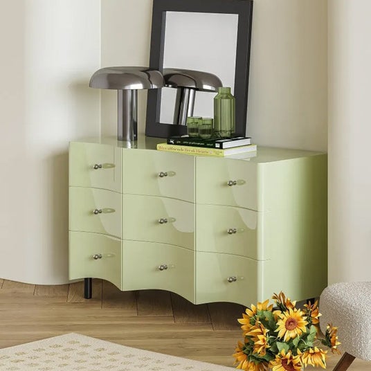 9つの引き出しで衣類や小物をすっきり収納できる多機能チェスト。グリーン系のカラフルな色合いが空間に自然に馴染み、一人暮らしからファミリーまで幅広く対応。高品質合板とパイン材を使用した頑丈な設計で長く使えます。