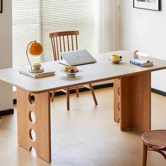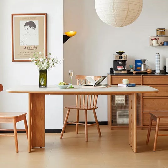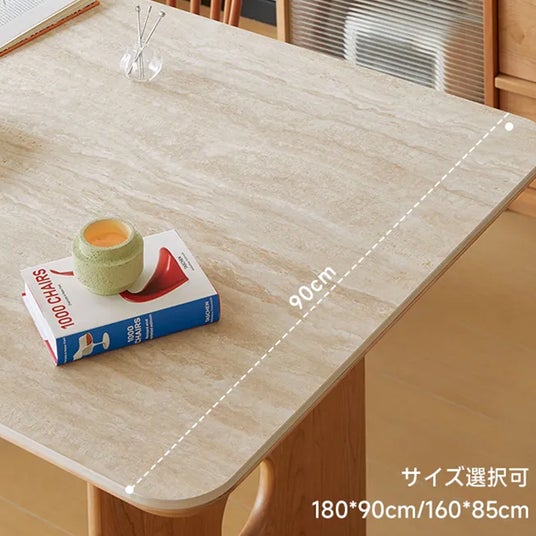 北米産FAS級チェリー材とトラバーチンを使用した高級ダイニングテーブル。幅90cmのワイド天板は家族団らんにぴったり。耐熱・撥水・耐傷性に優れ、お手入れも楽々。厚みのある二層構造と丸みのある角で、安全性と耐久性も抜群。組立も簡単で、安心して使えます。