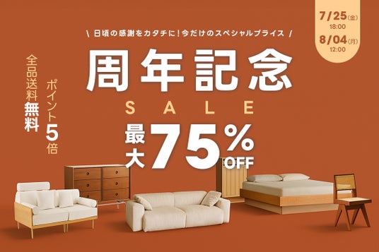この度、CAGUUU株式会社(本社:東京都港区、代表取締役社長:中村勇輝)は、おしゃれな高品質家具をリーズナブルな価格で展開する「CAGUUU」(呼称:カグー)にて、日頃よりご愛顧いただいている皆様への感謝の気持ちを込め、2025年7月25日(金)~8月4日(月)の期間、公式オンラインショップにて「周年記念セール」を開催いたします。