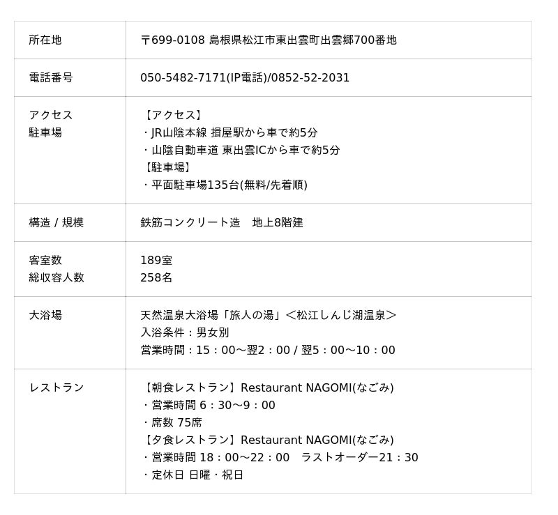 JR山陰本線 揖屋駅から車で約5分、山陰自動車道 東出雲ICより車で約3分に位置し、松江市街地や鳥取方面へのアクセスに便利な立地です。ご宿泊者様には無料のバイキング朝食、男女別天然温泉大浴場(松江しんじ湖温泉)をご用意しております。ビジネスや観光、スポーツ遠征など幅広い目的でご利用いただけます。