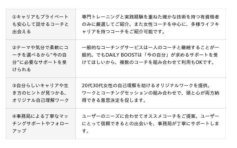 まずはDAILY BOOSTを通じて「20代30代女性の日常」に寄り添うコーチングという選択肢を届けながら、キャリアや恋愛、結婚、子どもといった分野で20代30代女性からよく聞かれるお悩みに応じたプログラムを開発していくことで、「20代30代女性が直面しやすい人生の分岐点」もより強力に支えるサービスもより充実させていきます。