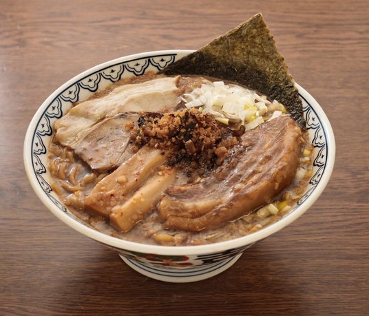 大きな角煮が目を引くばんからラーメンの代表とも言えるシグネチャーメニューは人気NO1商品。おいしさを引き出すために角煮ばんからに合った中細麺を使用しています。角煮をのせて完成するばんから基本の味は角煮の絶妙な甘味もポイント。熟成された甘味たっぷりの背脂スープと、こってりした旨味がファンを虜に