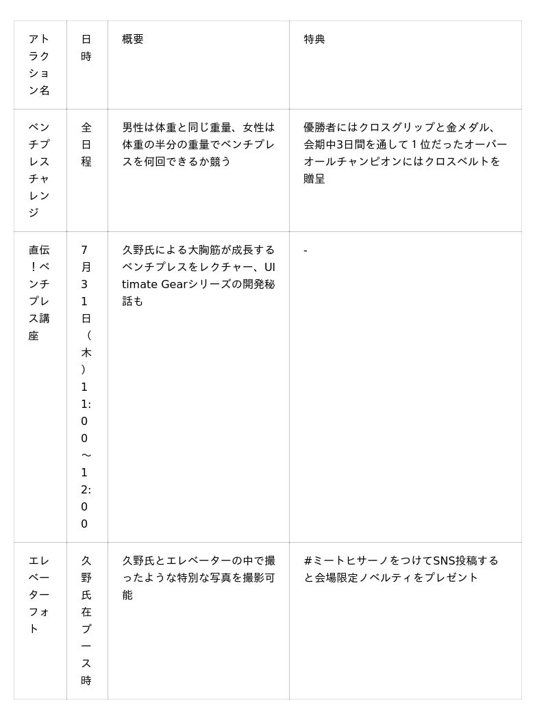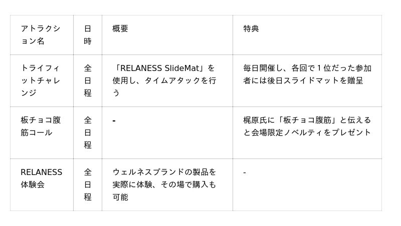 大きな目玉となるのは、日本屈指のボディアスリートである久野圭一氏と直接交流できる“ミートヒサーノ”エリアです。Ultimate Gearシリーズで久野氏の記録に挑むことができるベンチプレスチャレンジや、大胸筋を大きく成長させるベンチプレスについて久野氏が自らレクチャーする特別セミナーを実施します。久野氏と一緒に記念撮影ができるフォトブースもご用意しており、特別な日を写真に収めるファンにはたまらない体験を叶えます。また、“スライドマット・ライド”エリアでは、SASUKE出場、1stステージ歴代最速の俳優・梶原颯氏をメインパーソナリティに迎え、「RELANESS SlideMat」を使ったタイムアタックへの挑戦ができます。さらに、会場内のブース回遊による全身の疲れを癒す場としてご活用いただける“おやすみワールド”エリアでは、新製品の体験や、独自開発のAI技術を活用した柔道整復師・阿久澤真一先生のAIアバターとのリアルタイム対話体験を提供します。心ゆくまで筋肉のスペシャリスト達の視点を追体験した後は、インナーケアのプロフェッショナルの叡智が結集した完全栄養プロテインで心と体を満たす、“リッチラスタンド”エリアへ。ショコラティエ、茶人、和菓子職人といった味覚のプロフェッショナル達を唸らせた美味しさでも話題の「RICH RISE PROTEIN(通称:リッチラ)」の全4種類のフレーバーを、一挙に飲み比べできるチャンスです。