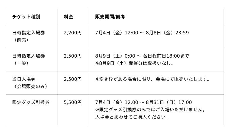 会期中は全日、日時指定となります。日時指定の時間が満枠となっていない時間帯には、当日入場券の販売を会場にて行います。当日券の情報は公式Xで告知予定です。■チケット料金・発売期間 ※金額は全て税込