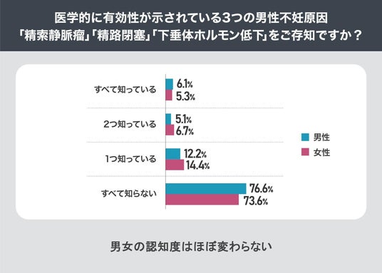 - 「不妊の原因の約半数は男性側にある」と知っている人は57%にとどまり、男性よりも女性の方が認識率が高い