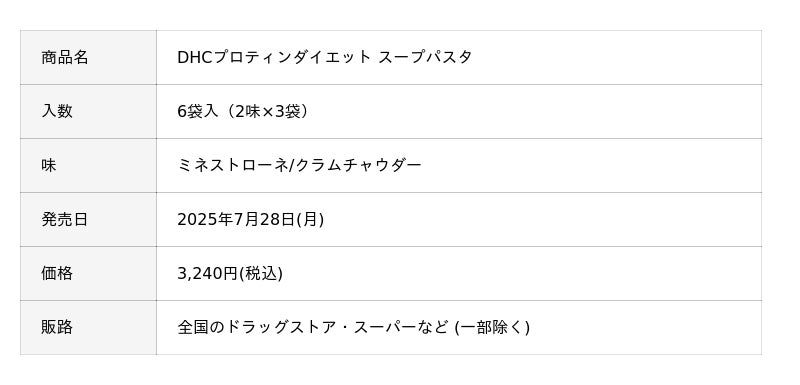株式会社ディーエイチシー(本社:東京都港区、代表取締役社長:宮崎 緑、以下:DHC)は、おきかえダイエット食「DHCプロティンダイエット スープパスタ」の6食入りパッケージを、全国のドラッグストア・スーパー※などで、2025年7月28日(月)より順次発売を開始いたします。