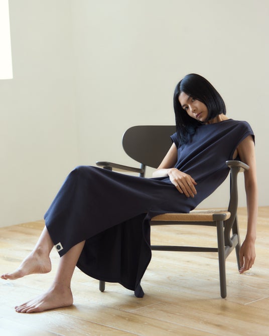 Summer Dress(サマードレス)風をまとう、夏のドレス。綿と植物由来のポリ乳酸を掛け合わせたドットスムース素材を採用。ダブルニット構造による伸縮性と、ピーチ起毛のなめらかな肌ざわりが、心地よさを叶えます。片側に深めのスリットを入れ、軽やかな足さばきとレイヤードの自由度をプラスした、抜け感と品のバランスが心地よい仕上がり。