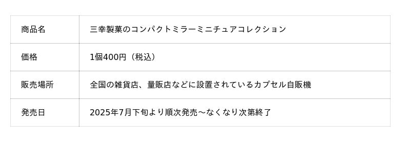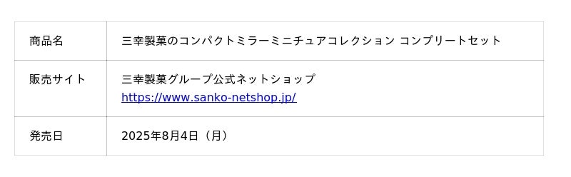 本カプセルトイの発売に合わせて、三幸製菓グループ公式ネットショップにて、全5種のミニチュアコンパクトミラーが揃ったコンプリートセットを数量限定で販売いたします。お近くに販売店のない場合や、一括で収集したいという方はぜひご利用ください。