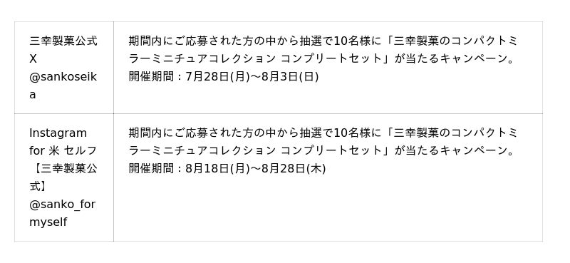 カプルトイ第3弾の発売を記念し、各SNSの当社公式アカウントで発売記念キャンペーンの開催を予定しております。7月下旬~8月は、三幸製菓の各SNS公式アカウントにぜひご注目を!