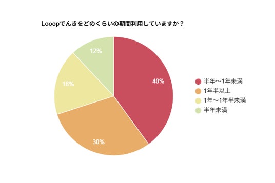 Looopでんきを現在利用している人に対してどのくらいの期間利用しているかを調査したところ、「1年~1年半未満」「1年半以上」と回答した人は全体の約5割になりました。この結果から、Looopでんきを利用している人は1年以上継続している人が多いということが明らかになりました。