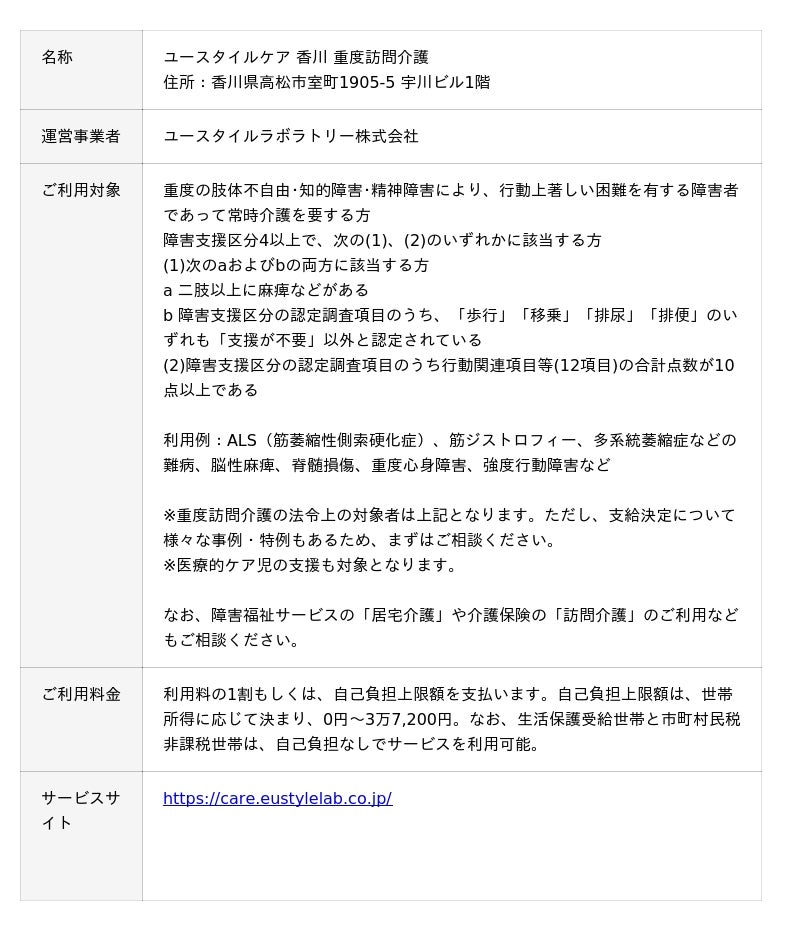 「すべての必要な人に、必要なケアを届ける。」をミッションに、重い障害や難病のある方に重度訪問介護事業を中心とした包括的介護福祉サービスを全国に届けるユースタイルラボラトリー株式会社(本社:東京都中野区、代表取締役:大畑健)は、2025年8月1日、「ユースタイルケア重度訪問介護」として香川県初となる重度訪問介護サービス事業所「ユースタイルケア 香川 重度訪問介護」事業所を開設します。