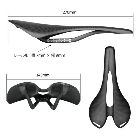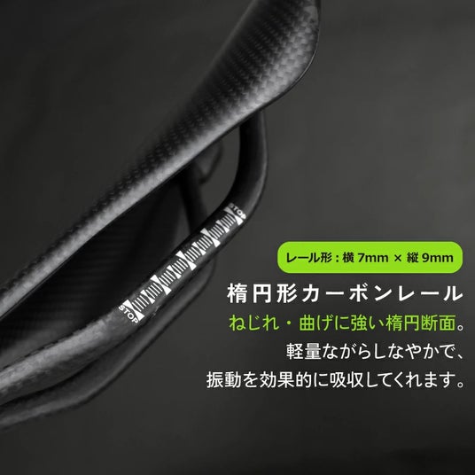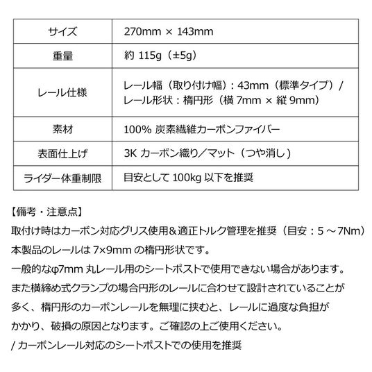 取り付け時はカーボン対応グリス使用&適正トルク管理を推奨(目安:5~7Nm)/ 本製品のレールは7×9mmの楕円形状です。一般的なφ7mm丸レール用のシートポストで使用できない場合があります。 また横締め式クランプの場合円形のレールに合わせて設計されていることが多く、楕円形のカーボンレールを無理に挟むと、レールに過度な負担がかかり、破損の原因となります。ご確認の上ご使用ください。/カーボンレール対応のシートポストでの使用を推奨/ライダー体重制限の目安:~100kg
