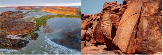 「ダンピア諸島」と「バーラップ半島」に位置する「ムルジュガ」は、地球上でもっとも重要な文化的景観のひとつです。幾層にも重なる赤い岩の断崖には、推定5万年以上前に遡る約200万点もの岩絵(ペトログリフ)が刻まれています。これらの古代の岩絵には、土地・海・儀式・家族・精霊といった物語を通して、アボリジナルの人々とこの地の深い結びつきの記録を見ることができます。