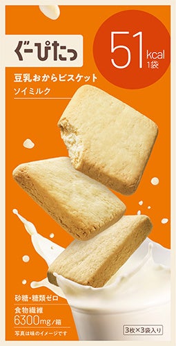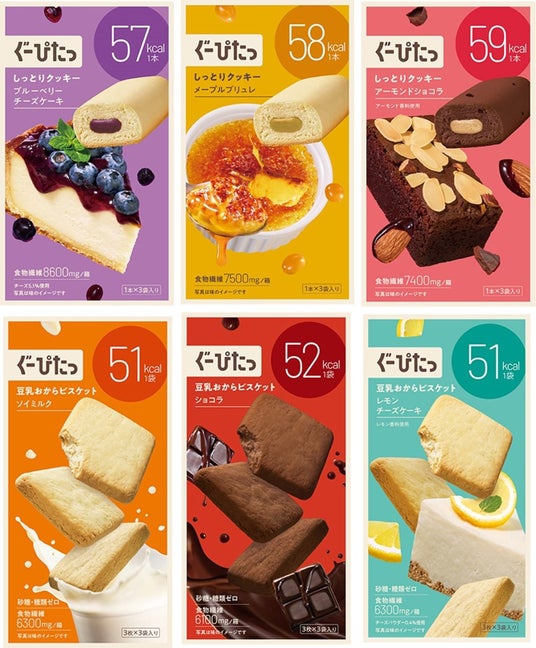 上段左から ぐーぴたっ しっとりクッキー ブルーベリーチーズケーキ・同 メープルブリュレ・同アーモンドショコラ 価格:オープン価格 参考価格:198円(税抜)214円(税込) 内容量 1箱3本入り/下段左から ぐーぴたっ 豆乳おからビスケット ソイミルク・同 ショコラ・同 レモンチーズケーキ