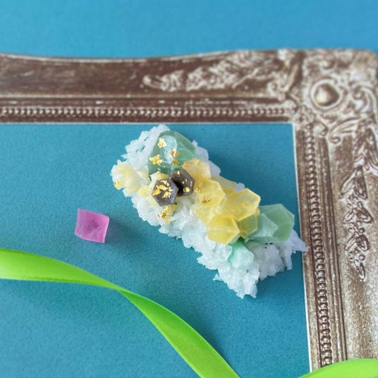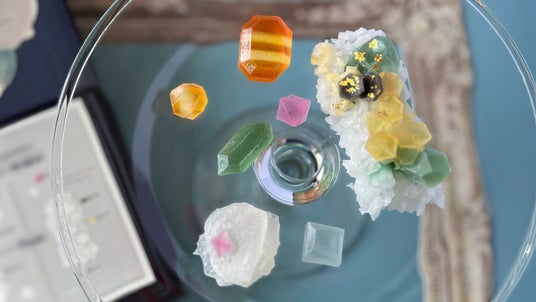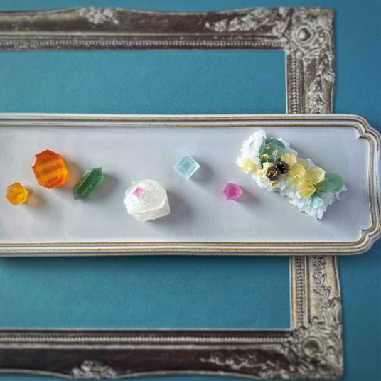 砂糖と寒天からできた和菓子の一種、琥珀糖。「こうぶつヲカシ」はこれに鉱物や宝石のイメージを加えた、アート作品のようなお菓子です。石の美しい佇まいを想像しながら、ひとつひとつ職人の手で切り出しており、どれひとつとして同じものはない唯一無二の作品が出来上がります。また、天然由来の色素を使った繊細な色のグラデーションの表現や、リキュールや果汁を使った多彩な味のバリエーションもこうぶつヲカシならではの魅力のひとつです。こうぶつヲカシという名前は、大好物と鉱物をかけ、いとをかしなお菓子として名づけました。