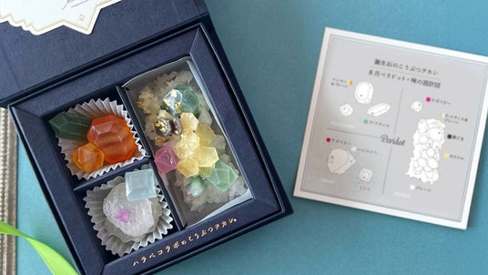 食とアートの境界を遊び心でつなぐ「ハラペコラボ」より、8月の誕生石をテーマにした琥珀糖「こうぶつヲカシ」が期間限定で登場しました。8月の誕生石「ペリドット」、「スピネル」、「サードニクス」の3つの鉱物を職人の手作業で表現しています。ひと際印象的な大きなこうぶつヲカシは、宝石としても人気の高いグリーンのペリドットの原石。縞模様が綺麗な瑪瑙(めのう)の一種サードニクスは夏味のマンゴー味です。『好奇心』の石言葉を持つレッドスピネルをかわいらしい原石にした形も入り、見ごたえのある一箱となっています。鉱物採取箱をイメージした化粧箱に、リボンを掛けてお届けしますので、大切な方や、誕生日の贈り物にもぴったりです。