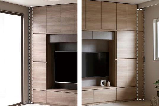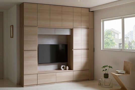1ミリ単位でサイズ調整ができ、天井や壁の梁を避けて設置が可能ですので、お部屋の間口や天井高さにぴったり収まりつつ、一体感があり無駄のない美しい収納をおつくりいただけます。