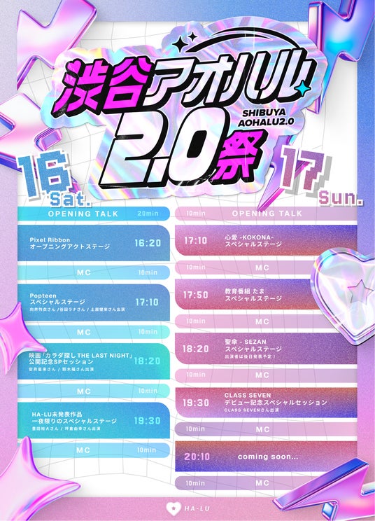 数分で心が夢中になるショートドラマレーベル・株式会社HA-LU(本社:東京都港区、代表取締役:岡春翔、以下「HA-LU」)は、2025年8月16日(土)・17日(日)の2日間にわたり、渋谷を舞台に開催される体験型カルチャーイベント「渋谷アオハル2.0祭」の追加出演者情報を発表いたします。